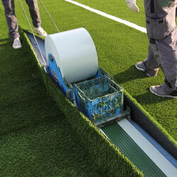 Die Nahtbandrolle wurde bereits in die Auftragsmaschine eingehängt und wartet auf ihren Einsatz: Durch die ständige Bewegung auf dem Spielfeld – und weil der Kunstrasen nicht vollflächig verklebt wird – sind die oft sehr elastischen Shock Pads einer ständigen „Walkbewegung“ ausgesetzt. Das kann im schlimmsten Fall zum Reißen von Nahtband und Kleber führen Die Kombination zwischen STAUF-Kunstrasenklebstoff und STAUF-Nahtband ist sehr flexibel, wirkt dem entgegen und macht die Bewegung mit. Nun kann der lösemittel- und wasserfreie R 201 in den Auftragsbehälter gefüllt und die Maschine zwischen zwei Kunstrasenbahnen in Position gebracht werden. Die Rasennaht muss dafür ein Stück weit geöffnet werden. Dann wird die Auftragsmaschine längst zur Naht zum anderen Ende der Kunstrasenbahnen gezogen. Die Maschine öffnet nun die Naht automatisch, legt das Nahtband aus und trägt den Klebstoff in Riefen auf. Ein Kunstrasenverleger geht mit und legt den Kunstrasen mit einem Spezialwerkzeug wieder in das Klebstoffbett ein. Regelmäßig muss Klebstoff „nachgeladen“ werden. In einem weiteren Arbeitsschritt werden dann die weißen Spielfeldmarkierungen aufgebracht: Dafür schneiden die Verleger Aussparungen in den bereits verlegten grünen Teppichrasen und kleben dort die Linien aus weißem Kunstrasen auf STAUF-Nahtband ein.